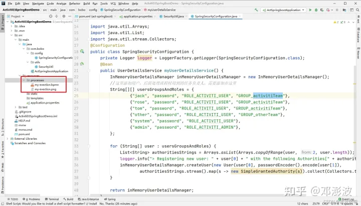 inMemoryUserDetailsManager.createUser(new User(user[0], passwordEncoder().encode(user[1]), authoritiesStrings.stream().map(s -> new SimpleGrantedAuthority(s)).collect(Collectors.toList()))); } return inMemoryUserDetailsManager; } @Bean public PasswordEncoder passwordEncoder() { return new BCryptPasswordEncoder(); }}2.4 创建bpmn文件