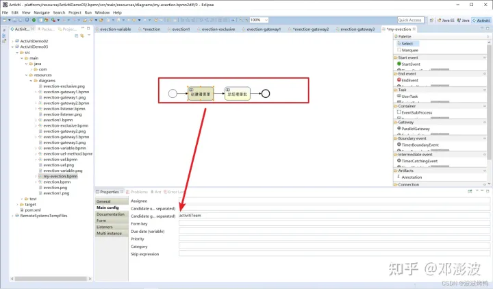 创建一个简单的bpmn文件,并设置任务的用户组,CandidateGroups,CandidateGroups中的内容要与在SpringSecurity的配置文件中配置的用户组的名称要保持一致,可以填写activitTeam或者otherTeam。这样填写的好处是,当不确定到底由谁来负责当前的任务的时候,只要是Groups内的用户都可以拾取这个任务