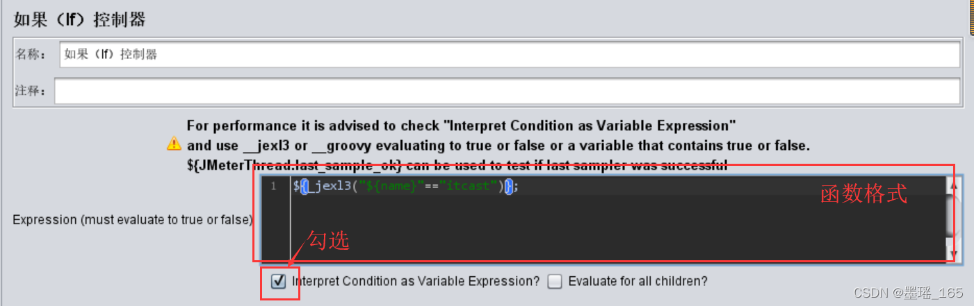 - 函数格式:${_jexl3("${name}"=="itcast")} #需要勾选下面的复选框