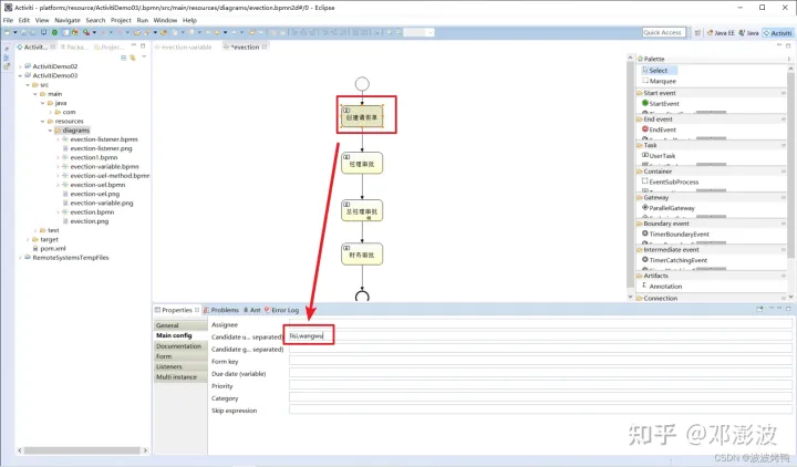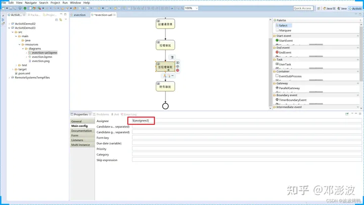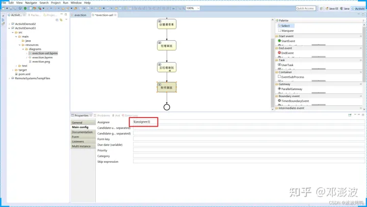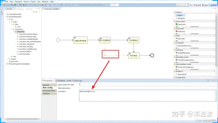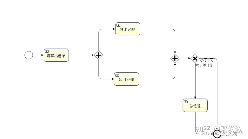 在部门经理审核后,走排他网关,从排他网关出来的分支有两条,一条是判断出差天数是否大于3天,另一条是判断出差天数是否小于等于3天。