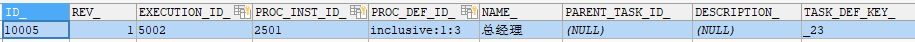 流程实例执行表:SELECT * FROM act_ru_execution,执行流程实例已经变为总经理审批,说明流程执行已经通过并行网关