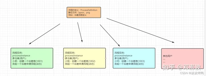 例如:用户或者程序安装流程定义的内容发起了一个流程,这个就是一个流程实例