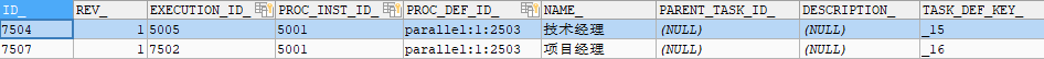 技术经理和项目经理是两个execution分支,在act_ru_execution表有两条记录分别是技术经理和项目经理,act_ru_execution还有一条记录表示该流程实例。